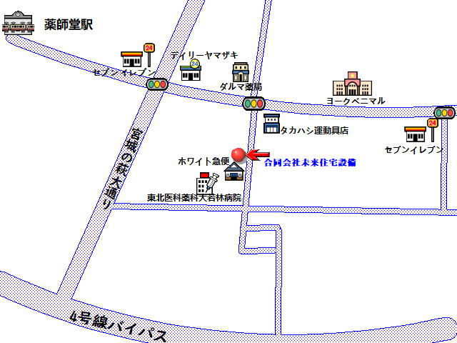 周辺地図 合同会社未来住宅設備 本社 〒984-0042 宮城県仙台市若林区大和町2丁目24-2 TEL.022-794-8907 仙南支店 〒989-1241 宮城県柴田郡大河原町字町202 アクセス 電車の場合 薬師堂駅(東西線)から徒歩約10分。 自動車の場合 長町インターチェンジから5km